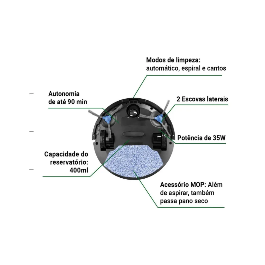 Com uma potência de 35W, o Aspirador Robô Philco consegue remover até as sujeiras mais difíceis, deixando os pisos brilhantes e bem cuidados. Ele é equipado com uma bateria de lítio que oferece até 90 minutos de autonomia, permitindo que o aparelho limpe grandes áreas sem precisar de recargas constantes. Seu design compacto e as rodinhas de movimentação feitas de plástico e borracha garantem que ele se mova suavemente por diferentes superfícies, adaptando-se a diversos tipos de piso com facilidade.