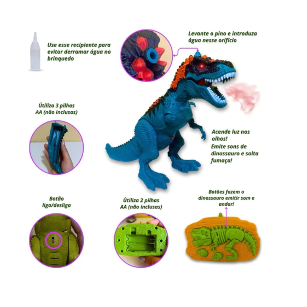 1 dinossauro de brinquedo com controle remoto e um recipiente para adicionar água