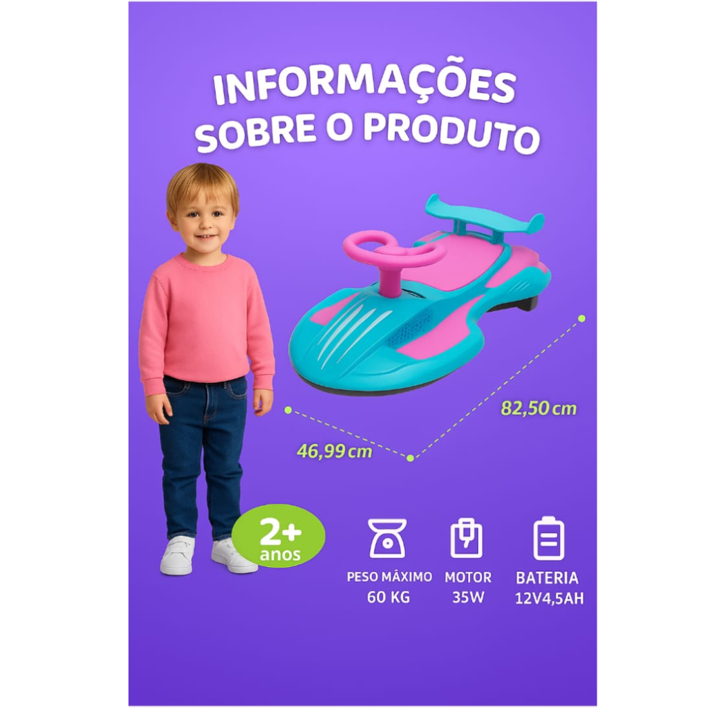 Segurança e estabilidade:  Capacidade máxima de carga de 60 kg, garantindo a segurança e o conforto das crianças. A velocidade pode ser controlada livremente pela criança, proporcionando uma experiência de direção mais segura.